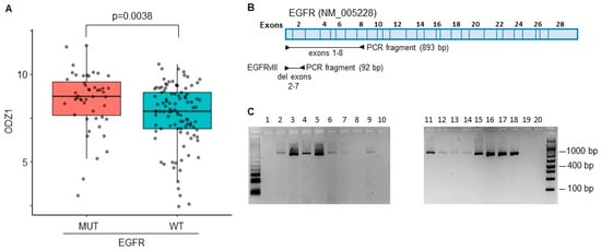 We analyzed the ODZ1 gene expression according to the EGFR mutational status in 214 GBM samples by using RNA-seq data from The Cancer Genome Atlas (TCGA) database following a protocol previously reported []. All single nucleotide mutations and insertions/deletions (indels) of the EGFR gene were included.