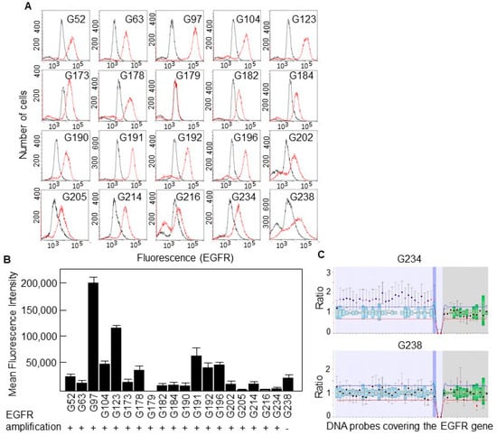 Expression of the EGFR protein in primary GBM cells. (A) EGFR expression was determined by FACS analysis. Red line, anti-EGFR antibody. Black line, isotype-matched control antibody. (B) Mean fluorescence intensity of FACS results and the gene amplification status of the EGFR in all the cell lines. Cell lines are ordered in the same way as in Figure 1C. (C) Representative result of a MLPA assay showing amplification of the entire EGFR gene.