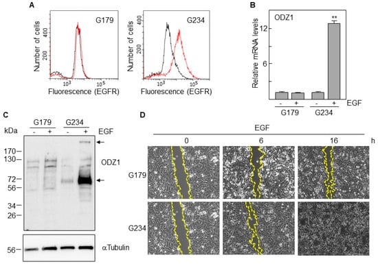 We selected two cell lines with marked differences in the expression of EGFR, G179, and G234 (Figure 3A). The first one, which has EGFR levels almost undetectable by flow cytometry, did not increase the expression of ODZ1 mRNA following culture with EGF. However, EGFR-expressing G234 cells increased, about 12-fold, the levels of ODZ1 in response to EGF (Figure 3B).