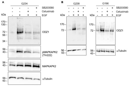 As expected, when G234 cells were treated with EGF in the presence of the EGFR-blocking antibody Cetuximab, the EGF-mediated upregulation of ODZ1 was abolished or highly reduced (Figure 4). The EGF binding to its cognate receptor is able to activate different signaling pathways, including p38 MAPK. It has been shown that in glioma cells, activation of p38 contributes to tumor invasion and is correlated to tumor grade, being considered a potential oncogenic factor in brain tumors []. Thus, we asked whether this pathway could mediate the overexpression of ODZ1 induced by the EGF–EGFR binding complex. Incubation of G234 cells with SB203580, a specific p38 MAPK inhibitor that blocks its catalytic activity [], drastically reduced both the levels of ODZ1 and the phosphorylation of MAPK-activated protein kinase 2 (MAPKAPK2), a direct target substrate of p38. A similar result, although to a lesser extent, was obtained following treatment with Cetuximab (Figure 4A). Downregulation of ODZ1 protein levels in GBM cells following the inhibition of EGFR/p38 was confirmed by analyzing the other two cell lines, G238 and G196, from the collection described in Figure 2 (Figure 4B).