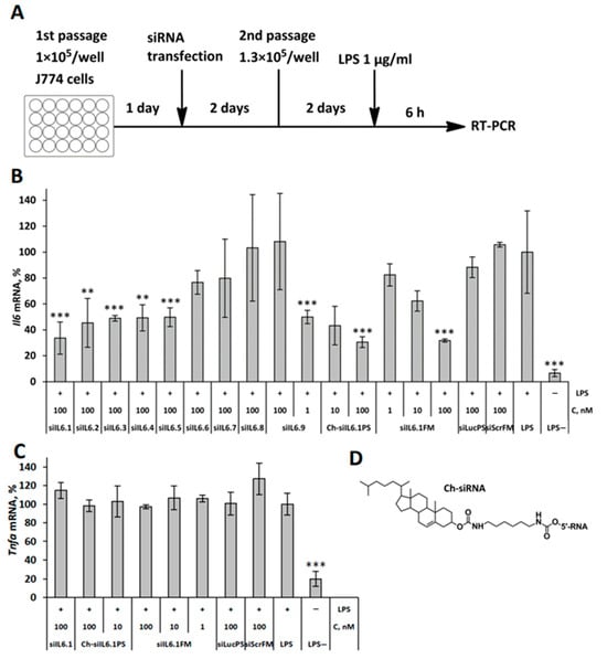 Silencing activity of anti-Il6 siRNAs and their cholesterol derivatives in J774 cells. (A) Experimental setup. Relative Il6 (B) and Tnfa (C) mRNA levels in J774 cells after LPS stimulation (1 μg/mL) siRNA transfection were carried out with Lipofectamine 2000. Mean values (±SD) and statistical significance of differences from LPS-treated cells (** p < 0.01, *** p < 0.01), calculated from the results of three independent experiments, are shown in the figure. (D) Schematic structure of the cholesterol conjugate.