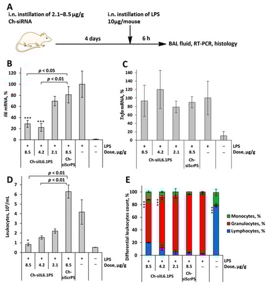 Biological effects of cholesterol-modified anti-Il6 siRNA (Ch-siIL6.1PS) on the development of ALI. (A) Experimental setup. (B) Il6 mRNA levels in BAL fluid cells. (C) Tnfa mRNA levels in BAL fluid cells. (D) Total and (E) differential leukocyte counts in the BAL fluid of healthy (LPS-) and LPS-challenged mice after Ch-siIL6.1PS administration and without treatment. Data are presented as mean ± standard error of the mean, n = 3–4, the difference from LPS-challenged mice: * p < 0.05, *** p < 0.001.