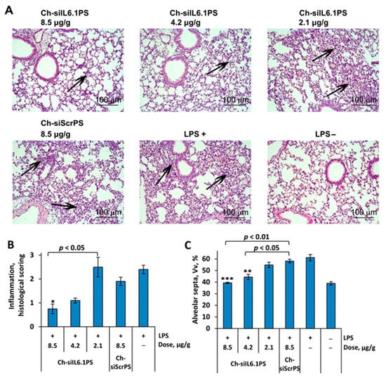 Ch-siIL6.1PS effectively suppresses LPS-induced lung inflammation in vivo. (A) Representative histological images of lung tissue from ALI mice. Hematoxylin and eosin staining. Original magnification: ×200. Black arrows indicate inflammatory infiltration in the lung tissue. (B) The intensity of inflammatory infiltration in the lung tissue of LPS-challenged mice was calculated by the semi-quantitative histological scoring system, where 0 is no inflammatory infiltration, 1 is low intensity of inflammatory infiltration, 2 is moderate intensity of inflammatory infiltration, and 3 is high intensity of inflammatory infiltration. (C) The volume densities (Vv, %) of alveolar septa reflect the intensity of interstitial edema in the lung tissue of LPS-challenged mice without treatment and after Ch-siIL6.1PS administration. All quantifications were performed in five random fields in each lung sample, forming 10–20 random fields from each experimental group. Data are presented as mean ± standard error of the mean, n = 3–5, the difference from LPS-challenged mice: * p < 0.05, ** p < 0.01, *** p < 0.001.