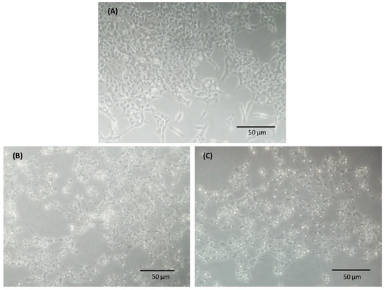 To assess glutamate- and H2O2-induced toxicity, R28 cells were exposed to different concentrations of glutamate and H2O2 for 24 h at 37 °C. The viability of the R28 cells was determined using the MTS assay according to the manufacturer’s protocol. A decrease in cell viability in a concentration-dependent manner of the stress factors (glutamate and H2O2) was observed (see Figure 1). After 24 h, a cell viability of 42% was observed after exposure to 3 mM of glutamate, and 56% was observed after exposure to 100 µM of H2O2. These parameters were considered stress conditions for further experiments. Prior to cell homogenization and MS analysis, a microscopic analysis was performed under a light microscope (Leica Microsystems GmbH, Wetzlar, Germany). This showed the morphological alteration and degeneration of the R28 cells after 24 h of exposure to 3 mM of glutamate and 100 µM of H2O2 (see Figure 2).