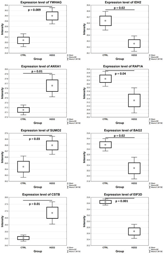 Differential expression of significantly altered proteins in R28 cells after exposure to H2O2 in comparison to control cells (p < 0.05). Box plots illustrate the expression levels of some proteins resulting from the analysis of MS data.