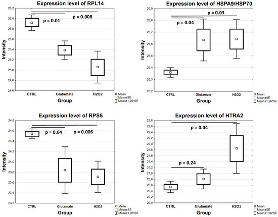 Differential expression levels of certain proteins in MS dataset. The box plot highlights the similar expression levels of altered proteins in R28 cells exposed to glutamate and H2O2 compared to CTRL (p < 0.05). Similar to the H2O2 group, HTRA2 was found to be highly expressed in the glutamate group compared to the CTRL, but this was not statistically significant (p > 0.05).