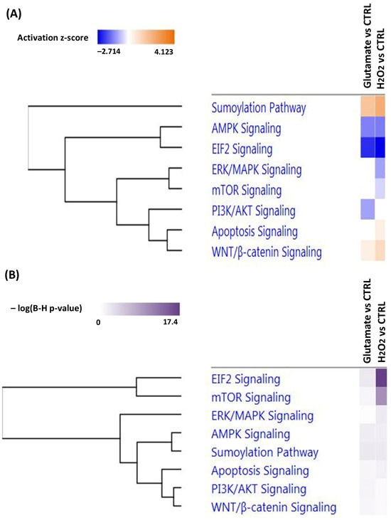 Top enriched canonical pathways. The hierarchical clustering shows the most affected canonical pathways related to significantly altered proteins in the R28 cells exposed to glutamate and H2O2 compared to the control. (A) exhibits the regulation of canonical pathways and biological functions. The negative regulation is depicted by the blue color and the positive regulation by the orange color based on activation z-scores of <−2 and >4. (B) was determined by the default IPA threshold [−log (p-value) > 0] between significantly changed proteins identified in our datasets and molecules in the respective pathways.