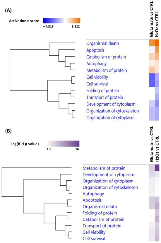 Top significantly affected biological functions in R28 cells after exposure to glutamate and H2O2 compared to untreated cells. (A) shows the regulation of biological functions. The downregulation is highlighted in blue and the upregulation in orange based on activation z-scores of <−4 and >3. (B) represents the hierarchical clustering of biological functions according to the −log10 (p-value) difference between significantly altered proteins identified in our datasets and molecules in the respective pathways.
