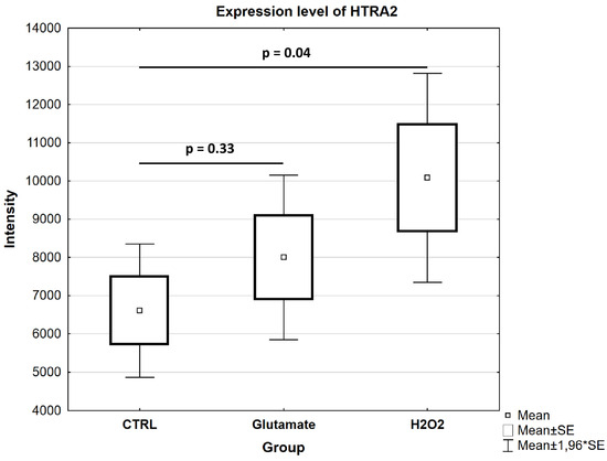 For the validation of the significantly altered proteins identified by mass spectrometry, we performed a quantitative analysis of the marker protein HTRA2 using microarrays in the different study groups (CTRL, glutamate and H2O2). The statistical analysis of the data revealed that HTRA2 was found in significantly high abundance in the H2O2-exposed cells compared to the control (p = 0.04; see Figure 8), and this was in agreement with the results obtained by mass spectrometry (see Supplementary File S3). Similar to the MS results, the data analysis also showed an increase in HTRA2 expression in the cells exposed to glutamate (see Figure 8), but this was not significant (p = 0.33; see Figure 5 and Supplementary File S2).