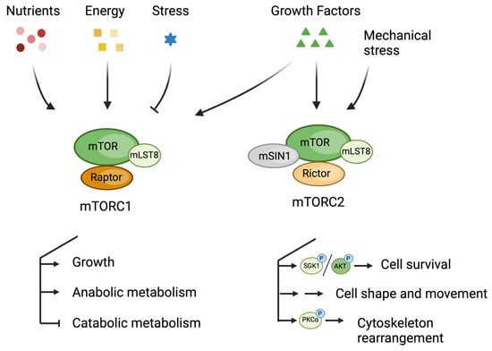 mTORC1 comprises three core components: mTOR, Raptor, and mLST8 (also known as GβL) (Figure 1) [1,2]. Raptor is crucial for mTORC1 assembly and substrate recruitment. It is exclusive to mTORC1. The interaction between Raptor and mTOR plays a regulatory role in nutrient-stimulated signaling, enhancing mTORC1 kinase activity and substrate specificity by binding to the TOR signaling motif (TOS). In contrast, mLST8 is a shared component of both mTORC1 and mTORC2. mTORC2 consists of mTOR and mLST8, but instead of Raptor, it includes two distinct core components: RICTOR and mSIN1 (Figure 1) [1,2,3]. RICTOR is essential for the assembly, substrate recognition, and stability of mTORC2. mSIN1 is an integral component of mTORC2 necessary for the assembly of the complex.