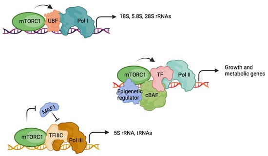 mTORC1 integrates signals from growth factors, nutrients, and oncogenic signals to promote cellular growth. Ribosomes are the cellular machinery responsible for synthesizing proteins, which play an essential role in supporting cellular growth [41]. In particular, rapidly growing cancer cells require a large number of ribosomes to support the high demand for protein synthesis [42]. Ribosome biogenesis is the process by which ribosomes are produced. It involves transcription of ribosomal RNAs (rRNAs) by Pol I and Pol III, and ribosomal proteins by Pol II, processing of pre-rRNA into mature rRNA, and assembly of ribosomal subunits [42]. It is estimated that ribosome biogenesis accounts for up to 90% of nuclear transcription, which is a high-energy-consuming event that requires tight regulation in order to adapt to changing environmental conditions and cellular needs. mTORC1 regulates Pol I transcription of the large rRNA precursor that is subsequently processed into mature 28S, 18S, and 5.8S rRNAs [16,23,43,44,45,46], and Pol III transcription of the 5S rRNA [23,24,46,47,48,49,50,51,52,53]. These rRNAs are core components of the ribosome. Additionally, mTORC1 controls transcription of transfer RNAs (tRNAs) by Pol III [23,24,46,47,48,49,50,51,52,53], which also plays an essential role in facilitating mRNA translation into polypeptides.