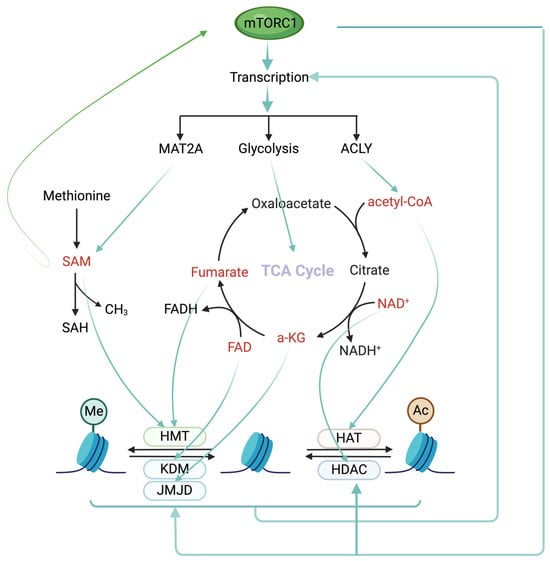 As previously discussed, mTOR controls metabolic pathways through epigenetic mechanisms, influencing the level and flux of essential metabolites in both glycolysis and the tricarboxylic acid (TCA) cycle. For example, SAM synthesis from methionine and ATP is regulated by the mTORC1–Myc–MAT2A axis [96]. mTORC1 stimulates ACLY expression, facilitating synthesis of acetyl-CoA through the mTORC1–SREBP signaling axis [97]. Many metabolites, including acetyl-CoA, flavin adenine dinucleotide (FAD), fumarate, α-ketoglutarate (α-KG), nicotinamide adenine dinucleotide (NAD+), nicotinamide (NAM), and S-adenosylmethionine (SAM), can also impact histone and DNA modifications by serving as either cofactors or substrates for epigenetic enzymes [98,99]. These metabolites, through influencing the activity of mTORC1 signaling or epigenetic enzymes, can serve as feedback mechanisms to finetune the expression programs in response to metabolic demands (Figure 4).