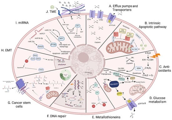 Global picture of the different resistance mechanisms: (A) Decreased intracellular cisplatin concentration caused by increased expression of cisplatin transporters. (B) Increased expression of anti-apoptotic proteins leads to a lack of cytochrome C release. (C) Increased antioxidant content results in the sequestration of cisplatin and degradation of toxic peroxides. (D) Metabolism change driven by the Warburg effect. (E) Metallothioneins chelate Zn2+ ions, which are essential for p53 functions, thereby preventing apoptosis through p53 activation and cisplatin sequestration. (F) Increased expression of DNA repair machinery components resulting in less persistent DNA damage and restoration of DNA integrity instead of apoptosis. (G) General properties of stem cells such as increased expression of glutathione and anti-apoptotic protein expression as well as general slower cell cycling. (H) Epithelial to mesenchymal transition (EMT)-induced expression of SNAIL, SLUG and SMUC inhibits p53, triggering Wnt signaling, which increases DNA repair. Moreover, TWIST activation inhibits apoptosis. (I) Several microRNAs, such as miR23a, miR96-5p, miR-21 and miR 210, confer resistance through many different signaling pathways such as PTEN, HIF1 and TWIST. (J) Chemotherapy and/or cytokines in the tumor microenvironment (TME), such as IL-6, influence the cellular characteristics of the cell, inducing its survival as well as the extracellular matrix preventing proper diffusion of both oxygen and cisplatin into the cell.