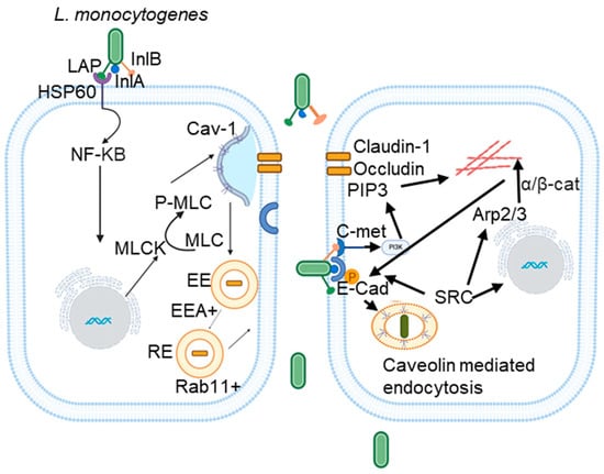To cross the gut intestinal epithelial cells and traverse the intestinal barrier, L. monocytogenes utilizes the coordinated action of LAP-dependent paracellular translocation and InlA-mediated transcytosis [35]. The bacterial surface protein LAP binds to its host cell surface receptor heat shock protein 60 (Hsp60), leading to the internalization of tight junction proteins, claudin-1, occludin, and the adherens junction protein E-cadherin via Cav-1 and MLCK-mediated endocytosis [33,35,41,42] (Figure 1). Recent studies by our group have shown that pharmacological inhibition of caveolin in cell lines (Caco-2) and genetic knockout of Cav-1 in mice blocks LAP-induced increases in intestinal permeability, junctional endocytosis, and L. monocytogenes translocation [43]. Once internalized, these junctional proteins are processed in early and recycling endosomes, resulting in the opening of cell junctions that permit L. monocytogenes to navigate through the intercellular spaces [43]. Following this initial junction opening by LAP, InlA subsequently binds directly to its receptor E-cadherin, facilitating InlA-mediated transcytosis across the gut epithelial barrier [43] (Figure 1).