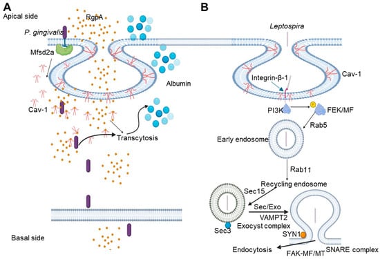 Schematics depicting the internalization mechanism of P. gingivalis and Leptospira via caveolin-mediated endocytosis. (A) The interaction of the virulent factor RgpA of P. gingivalis with Cav-1 in the host cell facilitates the internalization of P. gingivalis via caveolae. P. gingivalis inhibits the integrity of Mfsd2a, leading to enhanced transcytosis across the blood–brain barrier and increased Cav-1 expression, which induces albumin uptake to the cell (adapted from [89]). (B) Leptospiral species interacts with integrin-β-1 on host cells; it triggers caveolin to form an invagination; and through the caveolae/integrin-b1-PI3K/FAK-microfilament endocytosis pathway, it enters the host cell. To avoid fusion with lysosomes, it forms leptospiral vesicles inside the host cell, and these vesicles recruit Rab5/Rab11 and Sec/Exo-SNARE proteins in endocytic recycling and vesicular transport systems for intracellular migration and finally release from the cells through a SNARE complex-mediated FAK/microfilament/microtubule endocytosis pathway. Figure created using Biorender.