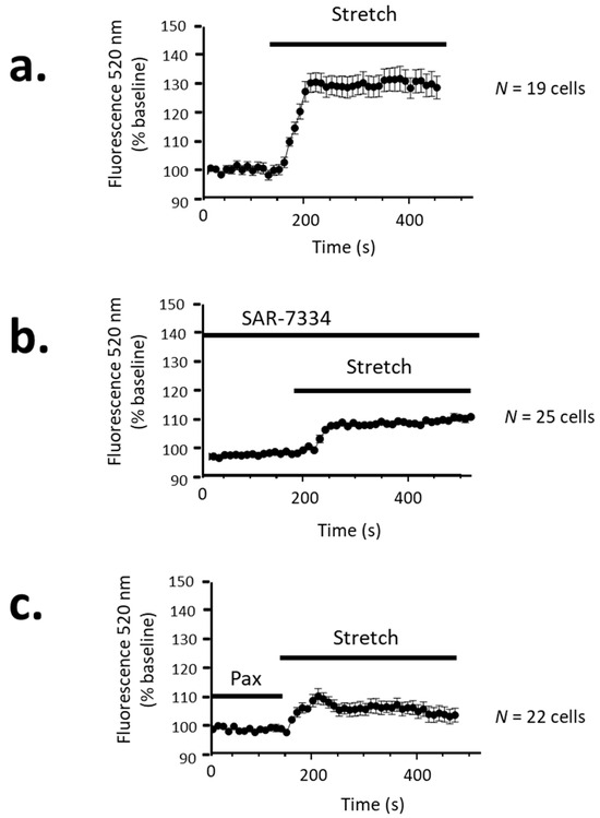 In the initial experiments, we examined whether the presence of functional BK channels can alter TRPC-mediated Ca2+ influx into cultured mouse podocytes, as reported earlier [22]. In these experiments, we utilized the indicator dye Calybryte-520™, which has Ca2+-dependent excitation and emission properties similar to Fluo-4 [24], but which yielded a stronger signal in podocytes. We activated podocyte TRPC6 using a hypoosmotic stretch stimulus that we have described in detail in a number of previous patch clamp analyses [13,25,26]. Specifically, exposing the podocytes to a solution with an osmotic strength of 70% of the control causes a robust activation of TRPC6 that can be sustained for as long as the stimulus is maintained [13], and which is completely blocked by the TRPC6 inhibitor SAR-7334 [1]. We observed a similar pattern with Ca2+ imaging, specifically, a marked increase in cytosolic free Ca2+ that was sustained for as long as the stimulus was maintained, at least up to several minutes (Figure 1a). However, pretreatment with 100 nM SAR-7334 for 10 min caused a marked reduction in the amplitude of the stretch-evoked Ca2+ signal (Figure 1b). At this concentration, SAR-7334 inhibits TRPC6 and TRPC3, but would not affect other TRP channels [27]. It should be noted that the endogenous TRPC of podocytes could include TRPC3 and TRPC6 heteromers. These experiments do not reveal the nature of the SAR-7334-resistant signal; however, we have previously shown that this drug causes a complete inhibition of podocyte TRPC6 currents at this concentration [1]. To assess the role of BK channels, we utilized 20 µM paxilline, which was shown in our previous work to cause the complete and irreversible inhibition of macroscopic BK currents in podocytes [19]. This drug would not affect other ion channels at this concentration [28]. In cells pretreated with paxilline for 10 min, we observed a marked reduction in stretch-evoked Ca2+ influx, comparable to that observed with SAR-7334 (Figure 1c). This observation is consistent with the hypothesis that the coordinated activation of Ca2+-dependent BK channels of podocytes [1] enables TRPC6 channels to sustain Ca2+ influx; this confirms the earlier observations and conclusions of Hu et al. [22]