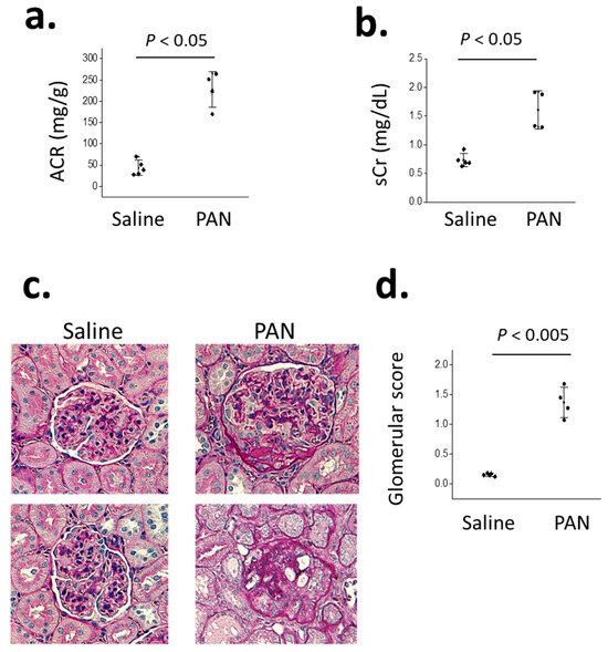 Evidence of kidney disease in Sprague Dawley rats 30-days after treatment with PAN or saline, as indicated. This experimental design is the chronic PAN nephrosis model: (a) increase in spot urine albumin:creatinine ratios (ACR) following PAN treatment; (b) increase in serum creatinine in PAN-treated rats compared to the control, indicating a decrease in the glomerular filtration rate; (c) glomerulosclerosis in PAN-treated rats compared to the saline-treated controls shown in representative PAS-stained section; and (d) mean glomerular score in saline- and PAN-treated rats based on the analyses of PAS-stained sections by an observer blind to the treatment group being scored. Points are results from individual animals. Error bars represent SD. Data were analyzed by Student’s unpaired t-test. In this experiment, there were N = 4 animals in each group.