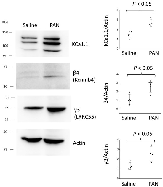 Increase in the expression of pore-forming and auxiliary subunits of BK channels in whole glomeruli isolated from saline- and PAN-treated rats during chronic PAN nephrosis. Representative immunoblots measuring pore-forming KCa1.1 subunits and auxiliary β4 and γ3 subunits are shown on the left (all from the same animal); quantitative densitometric analyses from the two groups of animals are shown on the right. Graphs show individual values and SD for N = 4 animals in each group.
