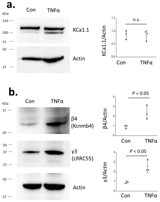 Effects of TNFα on BK channel subunits. Exposing cultured podocytes to 10 ng/mL TNFα for 24 h does not increase overall abundance of KCa1.1 (a) but increases overall abundance of auxiliary β4 and γ3 subunits (b). Representative blots are shown to the left. Points in graphs on the right are the results from each repetition and error bars represent SD. Data were analyzed by Student’s unpaired t-test.