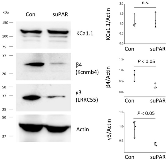 Exposing cultured podocytes to 20 ng/mL suPAR for 24 h had no effect on the overall abundance of pore-forming KCa1.1 subunits and caused a decrease in auxiliary β4 and γ3. Data were analyzed by Student’s unpaired t-test. n.s. denotes statistically non-significant difference.