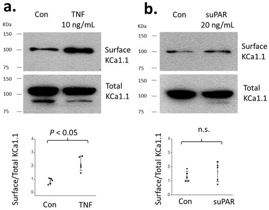 Exposing cultured podocytes to TNFα for 24 h increased cell surface expression of KCa1.1 (a); whereas suPAR had no effect (b). Graphs show individual values of the relative expression of surface and total KCa1.1 based on cell-surface biotinylation assays. Error bars represent SD. Data were analyzed by Student’s unpaired t-test. n.s. denotes statistically non-significant difference.