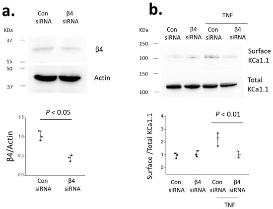 We have previously shown that many of the KCa1.1 subunits endogenously expressed in mouse podocytes are VEDEC variants, which refers to the last five residues at the carboxy terminus [18,19]. KCa1.1 subunits containing this motif are generally retained in intracellular compartments in a variety of cell types, but traffic to the surface in response to certain hormones [32] and as a result of interactions with other proteins, including β1-subunits of BK channels [33]. In addition, the VEDEC variants evoke a dominant-negative effect on the surface expression of other KCa1.1 splice variants [18]. In the present study, we have focused on the β4 subunit, which is the main β subunit expressed in podocytes [19]. We hypothesized that the effects of TNFα on the surface expression of KCa1.1 would correlate with their effects on the overall abundance of β4 subunits. This hypothesis predicts that suppressing the expression of β4 should reduce the stimulatory effects of TNFα on the surface abundance of KCa1.1. To test this hypothesis, we utilized siRNA techniques to reduce the abundance of β4 subunits in cultured podocytes; we measured the surface expression of KCa1.1 following 24 h exposure to 10 ng/mL TNFα (Figure 7). We observed that knockdown of the β4 subunit eliminated the ability of TNFα to stimulate surface expression of KCa1.1.