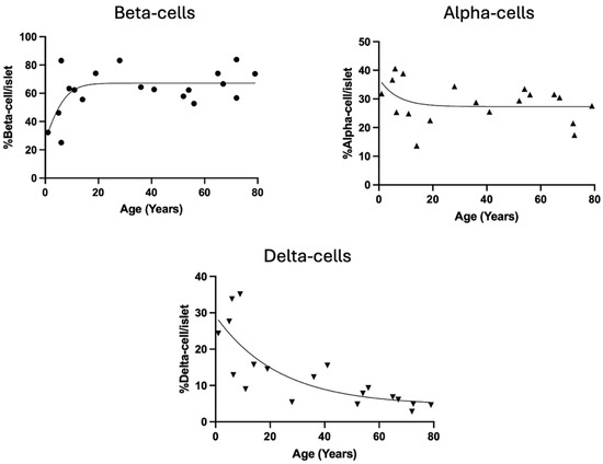Data are presented as mean ± SEM or by distribution of individual values with advancing age. The numbers of alpha-, beta-, or delta-cells within islets were found to follow a curvilinear distribution with age and were therefore analyzed by non-linear regression after exponential transformation. The abundance of bi-hormonal cell combinations within islets was found to be linearly distributed with age and was analyzed by linear regression using Prism 10 software (Graphpad Software, Boston, MA, USA). The statistical significance for R2 was set at p < 0.05.