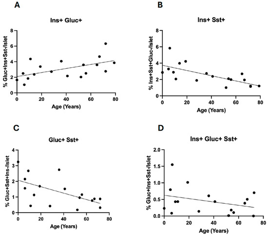 Percentage of multi-hormonal cell phenotypes within islets of Langerhans for individual pancreas donors distributed by donor age and expressed relative to all islet cells ((A) insulin/glucagon bi-hormonal cells, (B) insulin/somatostatin bi-hormonal cells, (C) glucagon/somatostatin bi-hormonal cells, (D) insulin/glucagon/somatostatin tri-hormonal cells). Data were analyzed by linear regression and the regression lines are shown.