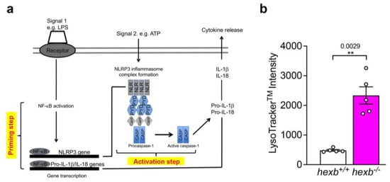 hexb−/− resident peritoneal macrophages (RPMϕ) isolated from 14-week-old mice display significantly greater LysoTrackerTM staining intensity in comparison with age-matched hexb+/+ RPMϕ. Panel (a), cartoon of the 2-signal regulation of IL-1β production by NLRP3 inflammasome. Priming and activation steps are highlighted in yellow. (b) Histogram of relative intensity of LysoTrackerTM staining of hexb+/+ RPMϕ (open columns) and hexb−/− RPMϕ (magenta-filled columns). Values, mean ± SEM, n = 5. Statistical analysis, Student’s t-test. ** p < 0.0029. Data are representative of a minimum of 3 independent experiments.