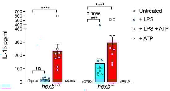 hexb−/− resident peritoneal macrophages (RPMϕ) from 14-week-old mice but not hexb+/+ RPMϕ secrete significant levels of IL-1β following LPS priming. Histogram of cytokine concentrations (pg/mL) determined by specific ELISA in culture supernatants of hexb−/− and hexb+/+ RPMϕ either untreated (unfilled circles), primed with LPS (cyan filled columns), primed with LPS and activated with ATP (red filled columns) or activated only (unfilled diamonds). Data are mean ± SEM, n = 8. Statistical analysis, One-way ANOVA. **** p < 0.0001 or *** p = 0.0056. Results are representative of 2 independent experiments.