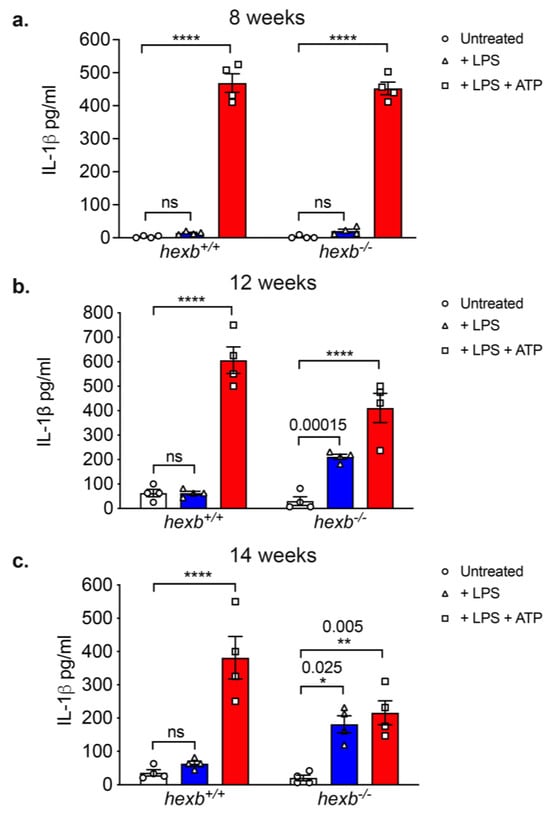 hexb−/− RPMϕ isolated from 12-week-old and 14-week-old symptomatic but not 8-week-old non-symptomatic mice display aberrant IL-1β production after priming. Histograms of ELISA measurements of IL-1β concentrations in supernatants of RPMϕ isolated from 8-week-old (a), 12-week-old (b), and 14-week-old (c) hexb+/+ and hexb−/− mice either untreated (open columns), primed with LPS (blue columns), or primed with LPS and activated with ATP (red columns). Data, mean ± SEM. n = 5 replicates for each sample. Statistical analysis, Student’s t-test **** p < 0.0001, ** p < 0.0.01, * p < 0.05. ns, not significant. Data are representative of three independent experiments.