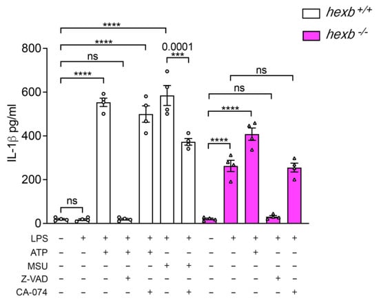 Inhibition of caspase-1 but not cathepsin B activity significantly reduces IL-1β production by LPS-primed hexb−/− RPMϕ isolated from 14-week-old mice. Histogram of ELISA determinations of IL-1β concentrations in supernatants of RPMϕ from 14-week-old hexb+/+ (open columns) or hexb−/− (magenta columns) mice either untreated, primed with LPS, primed with LPS and activated with ATP, or primed with LPS and incubated with monosodium urate crystals (MSU) in the absence or presence of the caspase-1 inhibitor zVAD-fmk or cathepsin B inhibitor, CA-074. Data are mean ± SEM, n = 5 replicates per treatment. Statistical analysis, one-way ANOVA. **** p < 0.0001, *** p = 0.001, ns, not significant. Data are representative of three independent experiments.