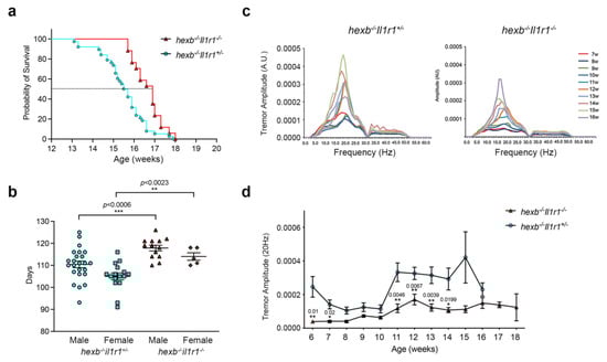 hexb−/−Il1r1−/− mice have a significantly extended lifespan and display improved tremors: (a) Kaplan–Meier survival plot of hexb−/−Il1r1−/− mice as compared with hexb−/−Il1r1+/− animals. (b) Both male and female hexb−/−Il1r1−/−mice have significantly extended lifespans in comparison with male and female hexb−/−Il1r1+/− animals. Data are mean ± SEM, n = 5–24. Statistical analysis, Student’s t-test; *** p = 0.0006, ** p = 0.0023. (c) Profile of tremor amplitudes at multiple frequencies for hexb−/−Il1r1+/− mice (left)) and hexb−/−Il1r1−/− mice (right) at different ages. (d) Tremor amplitude at 20 Hz for hexb−/−Il1r1+/− and hexb−/−Il1r1−/− mice at different ages. Data shown are mean ± SEM, n = 5–20. Statistical analysis, two-way ANOVA. Statistical significances are as indicated. Data are representative of two independent experiments.