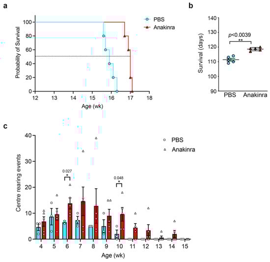 Anakinra-treated hexb−/− mice survived significantly longer than controls (Figure 8a), with a mean lifespan of 118.6 days for treated animals as against 111.4 days for vehicle-injected mice, equivalent to a 6.5% increase in survival (Figure 8b). The evaluation of center-rearing behavior, measured as the frequency that animals were able to stand on their hind legs in an open field within a five-minute period, was determined across the lifespan of both cohorts of mice. From 6 weeks of age, there was a trend for anakinra-treated mice to exhibit a greater number of rearing events, which reached statistical significance at 6 and 10 weeks of age, and this rearing activity persisted through to 14 weeks, whereas no rearing was recorded for vehicle-treated mice beyond 10 weeks of age (Figure 8c).