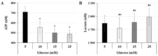 High-glucose concentration decreases total ATP production without affecting lactate production: (A,B) JEG-3 cells were cultured for 24 h in media containing normal-glucose (5 mM) or high-glucose (10, 15, and 25 mM) concentrations. (A) Quantitation of ATP production (n = 3) was assessed using the ATP luminescence detection assay kit. (B) Quantitation of lactate production (n = 3) was assessed using the Lactate-GloTM assay kit. Data are expressed as nM of ATP and lactate. * p < 0.05 indicates a significant difference compared to the 5 mM glucose group, and ns = nonsignificant difference.