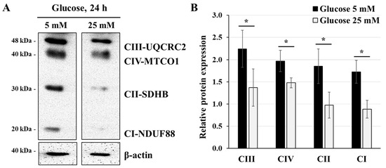 Because high-glucose condition is known to reduce ATP synthesis and mitochondrial function in trophoblast cells [2,3], and that variation in the expression of mitochondrial respiratory chain proteins is linked to enhanced [28] or lowered [29] cellular ATP synthesis levels, we evaluated the expression of mitochondrial respiratory chain proteins via western blot analysis (Figure 2A). JEG-3 cells were incubated for 24 h with glucose at either 5 mM or 25 mM—the concentration that mimics conditions of hyperglycemia in vivo. The results showed that incubating JEG-3 cells with 25 mM glucose significantly reduced the expression of all mitochondrial respiratory chain protein subunits: CI-NDUF88 (2-fold), CII-SDHB (1.9-fold), CIII-UQCRC2 (1.6-fold), and CIV-MTCO1 (1.3-fold) (Figure 2B). This indicates that cells growing in high-glucose conditions lead to alterations in mitochondrial function.