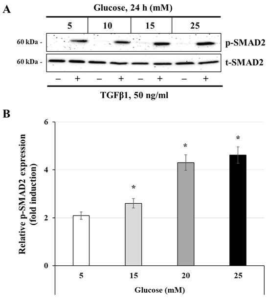 Glucose concentration regulates TGFβ1-induced SMAD2 phosphorylation: (A,B) JEG-3 cells were cultured for 24 h in media containing normal-glucose (5 mM) or high-glucose (10, 15, and 25 mM) concentrations, and then stimulated for 30 min with culture media alone (control) or with 50 ng/mL TGFβ1. (A) Representative images showing the expression of phosphorylated SMAD2 (p-SMAD2) and total SMAD2 (t-SMAD2), as evaluated by western blot. (B) Graphical analysis showing the expression levels of p-SMAD2 relative to t-SMAD2 for each glucose concentration (n = 3). * p < 0.05 denotes a significant difference compared to control.