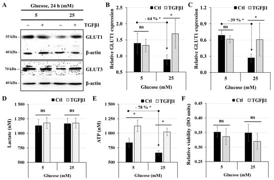 TGFβ1 differentially regulates glucose transporters expression, lactate, and ATP production: (A–E) JEG-3 cells were cultured for 24 h in media containing normal-glucose (5 mM) or high-glucose (25 mM) concentrations in the absence or presence of TGFβ1 at 50 ng/mL. (A) Representative images of GLUT1, GLUT3, and b-actin protein detection, as assessed by western blot. Graphical analysis showing the relative expression of GLUT1 (B) and GLUT3 (C) at 5 mM and 25 mM glucose. (D) Quantitation of lactate production was assessed using the Lactate-GloTM assay kit. (E) Quantitation of ATP production was assessed using the ATP luminescence detection assay kit. Data are expressed as nM of ATP and lactate (n = 3). (F) Quantitation of relative cell viability was assessed using the MTT assay (n = 3). Each bar represents the mean ± SD from at least two independent experiments. * p < 0.05 indicates a significant difference between the cell groups, and ns = nonsignificant difference.