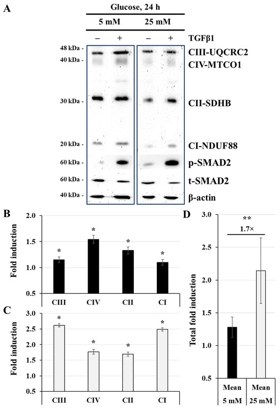 TGFβ1 enhances the expression of the mitochondrial respiratory chain proteins at normal-glucose and high-glucose concentrations: (A–D) JEG-3 cells were cultured for 24 h in media containing normal-glucose (5 mM) or high-glucose (25 mM) concentrations in the absence or presence of TGFβ1 at 50 ng/mL. (A) Representative images of OXPHOS complexes protein subunits detection, SMAD2 (p-SMAD2 and t-SMAD2), and β-actin, as assessed by western blot. Graphical analysis showing the expression of different mitochondrial complex protein subunits relative to β-actin at 5 mM (B) and 25 mM (C) glucose, and the summary of the total fold induction from all OXPHOS protein subunits in TGFβ1-stimulated cells relative to the control group (D). (B,C) * p < 0.05 indicates a significant difference compared to the control (n = 3). (D) ** p < 0.05 denotes a significant difference between 5 mM and 25 mM glucose concentrations.