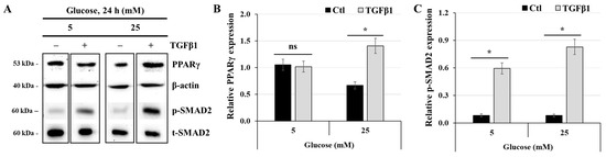 TGFβ1 increases the expression of PPARγ at high-glucose concentrations: (A–C) JEG-3 cells were cultured for 24 h in media containing normal-glucose (5 mM) or high-glucose (25 mM) concentrations in the absence or presence of TGFβ1 at 50 ng/mL. (A) Representative images of PPARγ, β-actin, and SMAD2 (p-SMAD2 and t-SMAD2), as assessed by western blot. Graphical analysis showing the relative expression of PPARγ (B) and p-SMAD2 (C) at 5 mM and 25 mM glucose (n = 3). * p < 0.05 indicates a significant difference between control and TGFβ1 treatments, and ns = nonsignificant difference.