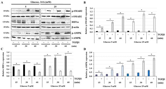 TGFβ1 decreases HIF1α expression but enhances AMPK activation at normal-glucose and high-glucose concentrations: (A–D) JEG-3 cells were cultured for 24 h in media containing normal-glucose (5 mM) or high-glucose (25 mM) concentrations, and then activated in the absence or presence of TGFβ1 at 50 ng/mL for 15, 30, or 60 min. (A) Representative images of SMAD2 (p-SMAD2 and t-SMAD2), HIF1α, b-actin, and AMPK (p-AMPK and t-AMPK), as assessed by western blot. Graphical analysis showing the relative expression of p-SMAD2 (B), HIF1α (C), and p-AMPK (D), at 5 mM and 25 mM glucose (n = 3). * p < 0.05 indicates a significant difference between the cell groups.