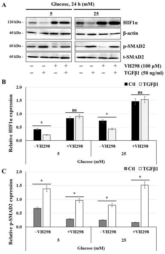 TGFβ1-induced HIF1α degradation is blocked in the presence of VH298, a specific inhibitor of ubiquitylation and proteasomal degradation of HIF1α: (A–C) JEG-3 cells were cultured for 24 h in media containing normal-glucose (5 mM) or high-glucose (25 mM) concentrations and then activated for 60 min with TGFβ1 in the absence or presence of VH298. (A) Representative images of HIF1α, β-actin, and SMAD2 (p-SMAD2 and t-SMAD2), as assessed by western blot. Graphical analysis showing the relative expression of HIF1α (B) and p-SMAD2 (C) at 5 mM and 25 mM glucose (n = 3). * p < 0.05 indicates a significant difference between the cell groups, and ns = nonsignificant difference.