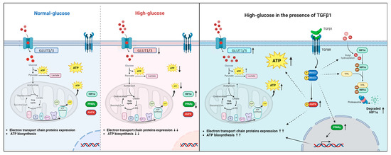 Elevated blood glucose levels at the fetal–maternal interface are associated with problems in placental trophoblasts and an increased risk of pregnancy-related complications. Our study suggests that TGFβ1 may play a protective role against the negative effects of high-glucose concentrations on trophoblast JEG-3 cells. Our results showed that high-glucose treatments disrupted energy and mitochondrial metabolism, which was indicated by a decrease in ATP production without affecting lactate production. At the molecular level, this was demonstrated by an increase in HIF1α expression and nuclear localization, a decrease in PPARγ expression and nuclear localization, and a decrease in the expression of GLUT1, GLUT3, and respiratory chain proteins. Our study is the first to demonstrate that TGFβ1 can have a protective effect by restoring ATP production under high-glucose stress conditions by inducing HIF1α degradation, AMPK activation, and restoring PPARγ and respiratory chain protein expression (Figure 10).