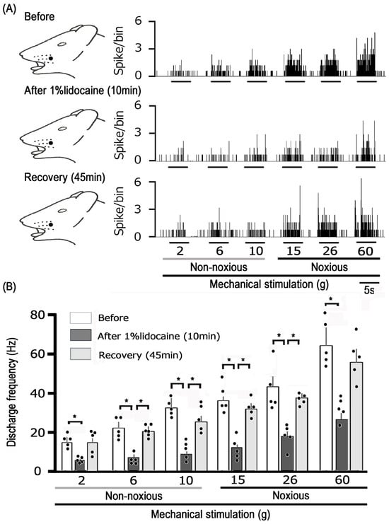 The consequences of administering 1% lidocaine (37 mM) subcutaneously in the peripheral receptive field on TG neuron responses to non-noxious and noxious stimuli. (A) Typical examples of TG neuron activity in response to non-noxious (2, 6, and 10 g) and noxious (15, 26, and 60 g) mechanical stimulation before and 10 min and 45 min after 1% lidocaine administration (37 mM). Receptive field of the whisker pad in the facial skin. The shaded region represents the location and extent of the receptive field. (B) Temporal pattern of lidocaine application in the peripheral receptive field on the average firing rate of TG neurons responding to non-noxious and noxious mechanical stimulation. * p < 0.05, compared with 10 min after 1% lidocaine administration (n = 5). The values are mean ± standard error.