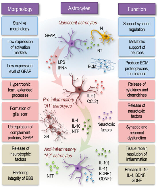 In contrast, anti-inflammatory (A2) astrocytes are induced by anti-inflammatory cytokines such as IL-4 or IL-10 and are linked to tissue repair and inflammation resolution [64]. A2 astrocytes express neurotrophic factors, including glial cell line-derived neurotrophic factor (GDNF) and brain-derived neurotrophic factor (BDNF), alongside anti-inflammatory cytokines and detoxifying enzymes. These astrocytes provide neuroprotection, support neuronal survival, and facilitate tissue repair, working to restore a healthier environment in the CNS [65,66,67,68].