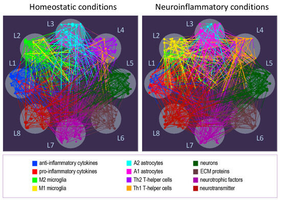 Intercellular interactions within this network form a web of mutual influences and interdependencies, with each cell type contributing to the overall functioning of the nervous system [1,11]. This interdependent network can be conceptualized as a graph, with cells representing nodes and intercellular interactions representing links or edges. They can either maintain homeostasis or drive maladaptive processes like neuroinflammation. The multilayered nature of this network ensures both robustness under normal conditions and vulnerability in the face of chronic insults or dysregulation. By integrating cellular and molecular data, understanding neuroinflammation through a network approach offers insight into the multi-level organization of inflammatory processes, revealing feedback loops and potential key regulatory hubs, thus paving the way for targeted therapeutic strategies to restore balance and resilience.