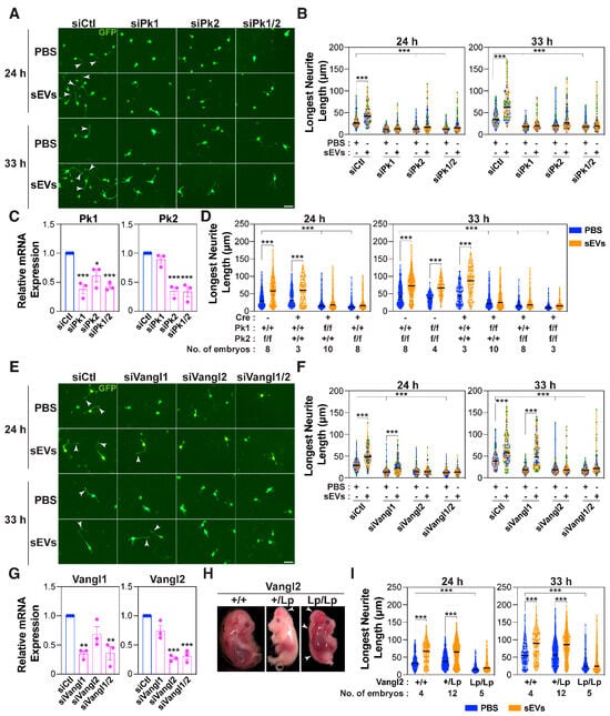Exosomes have previously been shown to mobilize autocrine Wnt-planar cell polarity (PCP) signaling in breast cancer cells []. PCP signaling was first described for its function in modulating tissue polarity by aligning cells in a single plane, perpendicular to the apical-basal axis [,,,]. In vertebrates, PCP signaling also functions in the development of the inner ear, orientation of hair follicles, and convergent extension (CE) movements during gastrulation and neural tube closure [,,,,,]. In the CNS, PCP modulates numerous developmental processes including differentiation of neural progenitor cells, neuronal migration, axon guidance, and dendritic arborization [,,,]. Core components of the PCP pathway are the seven-pass transmembrane Frizzled (Fzd) receptors, four-pass transmembrane Van-Gogh-like (Vangl) proteins, and cytoplasmic proteins including Prickle (Pk) and Dishevelled (Dvl) [,,,]. Unlike in Drosophila, Wnt morphogens play an important role in regulating PCP signaling in vertebrates and may act as an instructive cue [].