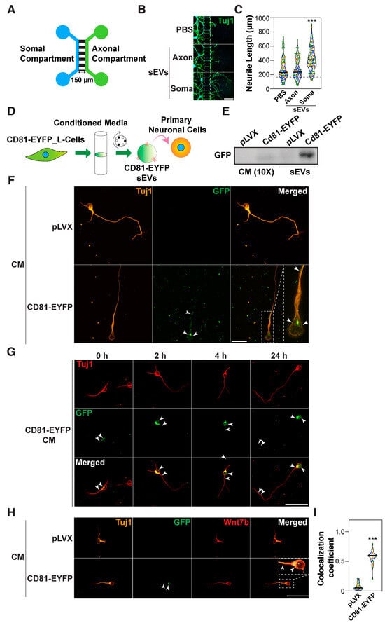 For Vangl2 localization, the intensity of Vangl2 in the soma, proximal axon, and distal axon was quantified using Nikon NIS-Elements software (Version 5.41.00). For sEVs and Wnt7b co-localization, neurons were identified using Tuj1 as a reference channel, and the Pearson’s colocalization coefficient for GFP (sEVs) and Wnt7b was determined using Nikon NIS-Elements software (Version 5.41.00).