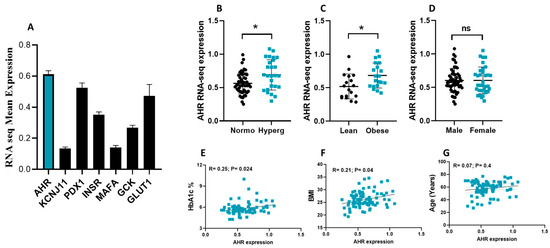 Expression analysis of AHR in human pancreatic islets. (A) RNA-seq expression of AHR, KCNJ11, PDX1, INSR, MAFA, GCK, and GLUT1 in human islets obtained from non-diabetic donors (n = 49). (B). AHR expression levels in human islets obtained from diabetic/hyperglycemic donors (n = 25) compared to nondiabetic/normoglycemic islet (n = 49) donors. (C) AHR expression levels in human islets obtained from lean donors (n = 18; BMI below 24) compared to obese donors (n = 19; BMI above 29). (D) AHR expression levels in human islets obtained from male donors (n = 53) compared to female donors (n = 33). Correlation of AHR expression with HbA1c% (n = 66) (E), BMI (n = 87) (F), or age (n = 87) (G). *; p > 0.05, ns; not significant. Bars represent mean ± SEM. Nonparametric Mann–Whitney t-tests were used in (B–D). Nonparametric Spearman’s correlation test was used in (E–G).