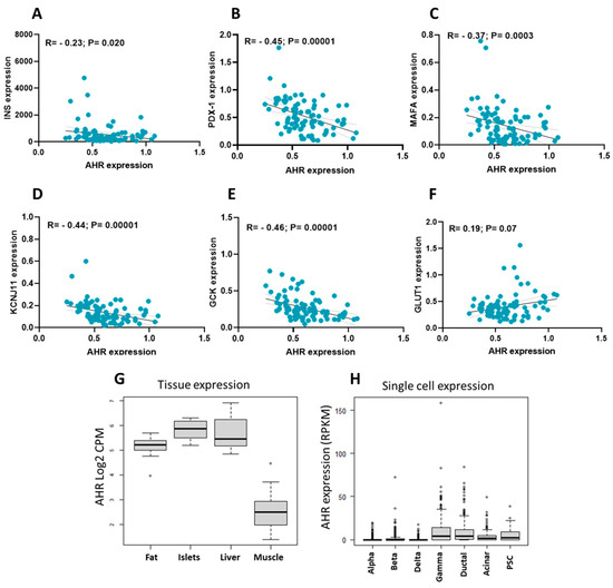 Expression correlations of AHR with key pancreatic β-cell markers. Expression of AHR was correlated with INS (A), PDX1 (B), MAFA (C), KCNJ11 (D), GCK (E), and GLUT1 (F) using nonparametric Spearman’s correlation. (G) Expression levels of AHR in human fat tissue (n = 12), pancreatic islets (n = 12), liver (n = 12), and skeletal muscle tissues (n = 12), obtained from the same donors. (H) Expression levels of AHR in sorted pancreatic cells, ductal, acinar, or PSC as obtained from Islet Gene View (IGV) web tool.